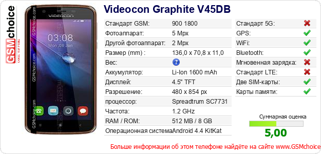 Данные о телефоне Videocon Graphite V45DB на Вашем сайте