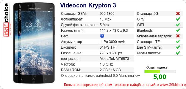 Данные о телефоне Videocon Krypton 3 на Вашем сайте