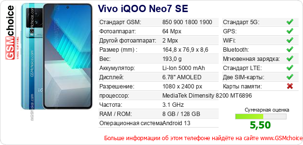 У Тебя есть свой сайт? Хочешь где-то разместить информацию о базовых данных мобильника Vivo iQOO Neo7 SE ? Это запросто устроить. Достаточно скачать картинку или скопировать и разместить на соответствующем сайте нижерасположенный код:Размещение этого кода вызовет появление нижерасположенной картинки: