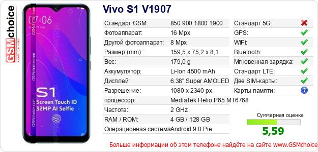 Данные о телефоне Vivo S1 V1907 на Вашем сайте