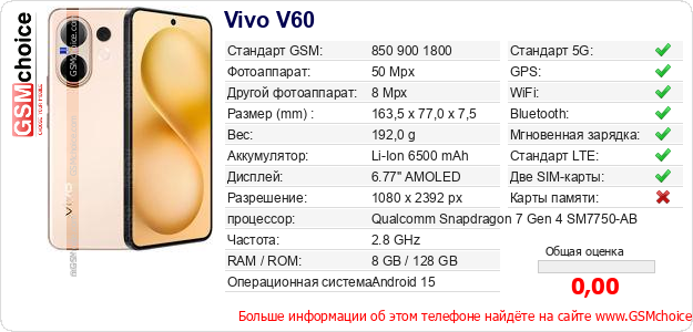 У Тебя есть свой сайт? Хочешь где-то разместить информацию о базовых данных мобильника Vivo V60 ? Это запросто устроить. Достаточно скачать картинку или скопировать и разместить на соответствующем сайте нижерасположенный код:Размещение этого кода вызовет появление нижерасположенной картинки: