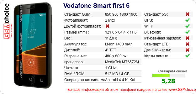 Данные о телефоне Vodafone Smart first 6 на Вашем сайте