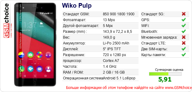 Данные о телефоне Wiko Pulp на Вашем сайте