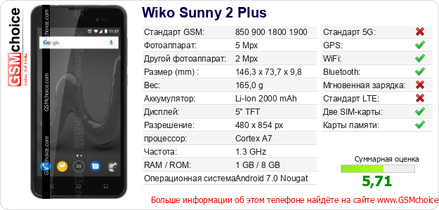 Данные о телефоне Wiko Sunny 2 Plus на Вашем сайте