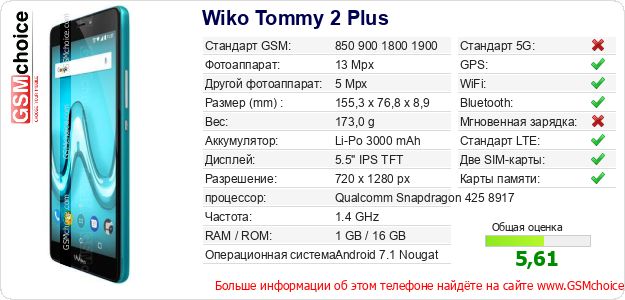 Данные о телефоне Wiko Tommy 2 Plus на Вашем сайте