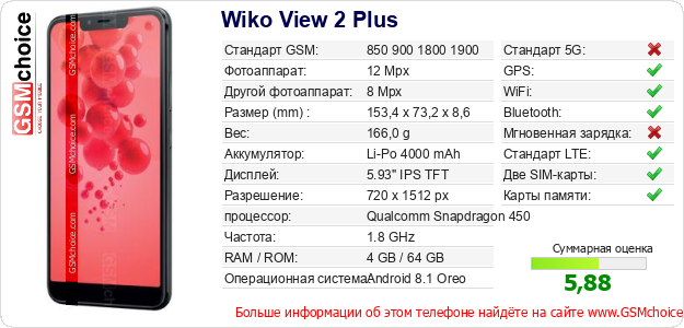Данные о телефоне Wiko View 2 Plus на Вашем сайте
