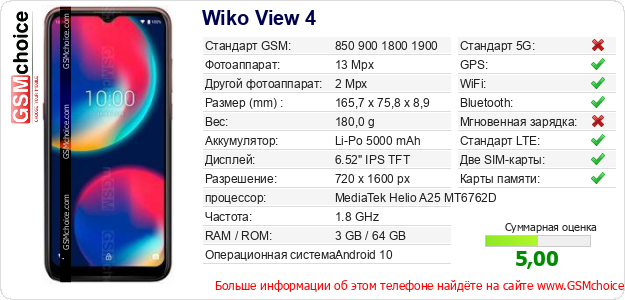 Данные о телефоне Wiko View 4 на Вашем сайте