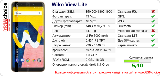 Данные о телефоне Wiko View Lite на Вашем сайте