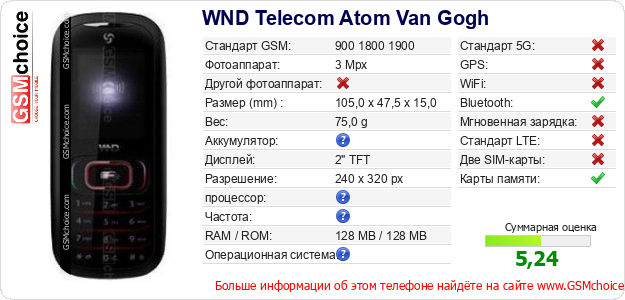 Данные о телефоне WND Telecom Atom Van Gogh на Вашем сайте