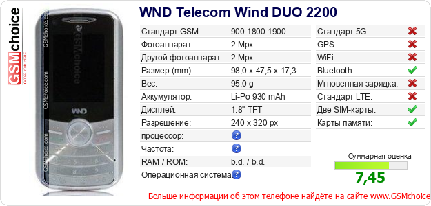 Данные о телефоне WND Telecom Wind DUO 2200 на Вашем сайте