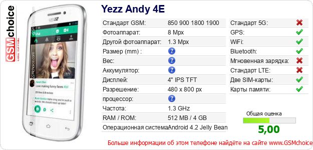 Данные о телефоне Yezz Andy 4E на Вашем сайте