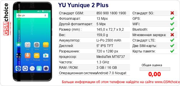 Данные о телефоне YU Yunique 2 Plus на Вашем сайте