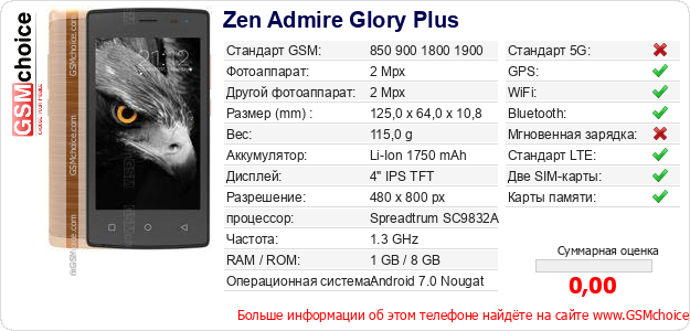 Данные о телефоне Zen Admire Glory Plus на Вашем сайте