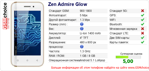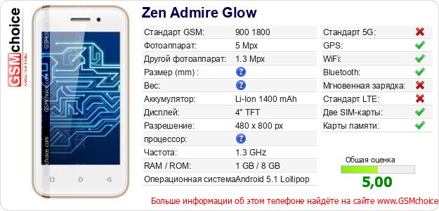 Данные о телефоне Zen Admire Glow на Вашем сайте