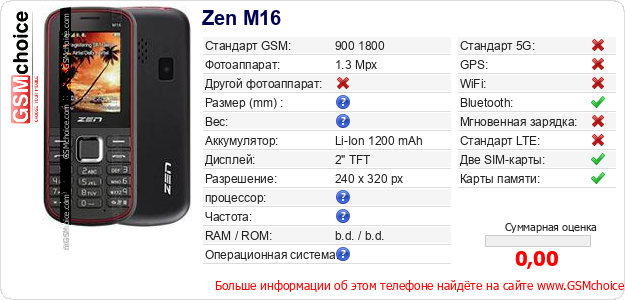Данные о телефоне Zen M16 на Вашем сайте
