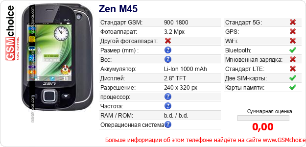 У Тебя есть свой сайт? Хочешь где-то разместить информацию о базовых данных мобильника Zen M45 ? Это запросто устроить. Достаточно скачать картинку или скопировать и разместить на соответствующем сайте нижерасположенный код:Размещение этого кода вызовет появление нижерасположенной картинки: