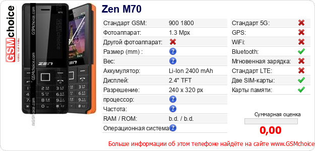 У Тебя есть свой сайт? Хочешь где-то разместить информацию о базовых данных мобильника Zen M70 ? Это запросто устроить. Достаточно скачать картинку или скопировать и разместить на соответствующем сайте нижерасположенный код:Размещение этого кода вызовет появление нижерасположенной картинки: