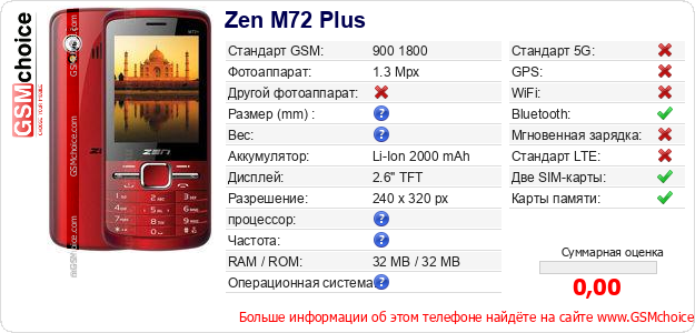 Данные о телефоне Zen M72 Plus на Вашем сайте