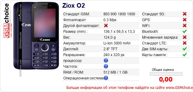 У Тебя есть свой сайт? Хочешь где-то разместить информацию о базовых данных мобильника Ziox O2 ? Это запросто устроить. Достаточно скачать картинку или скопировать и разместить на соответствующем сайте нижерасположенный код:Размещение этого кода вызовет появление нижерасположенной картинки: