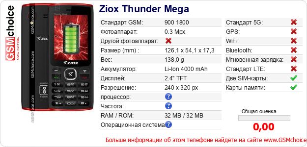 Данные о телефоне Ziox Thunder Mega на Вашем сайте