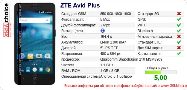 Данные о телефоне ZTE Avid Plus на Вашем сайте