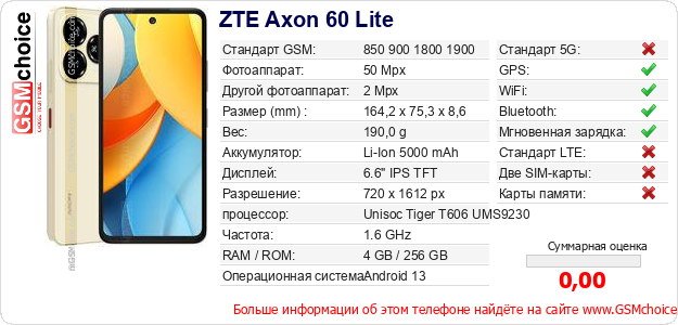Данные о телефоне ZTE Axon 60 Lite на Вашем сайте