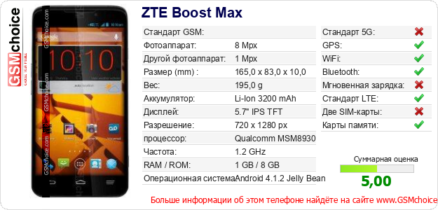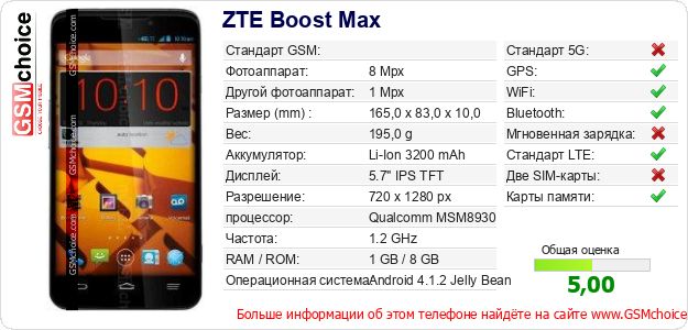 Данные о телефоне ZTE Boost Max на Вашем сайте