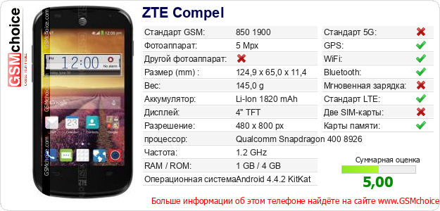 У Тебя есть свой сайт? Хочешь где-то разместить информацию о базовых данных мобильника ZTE Compel ? Это запросто устроить. Достаточно скачать картинку или скопировать и разместить на соответствующем сайте нижерасположенный код:Размещение этого кода вызовет появление нижерасположенной картинки: